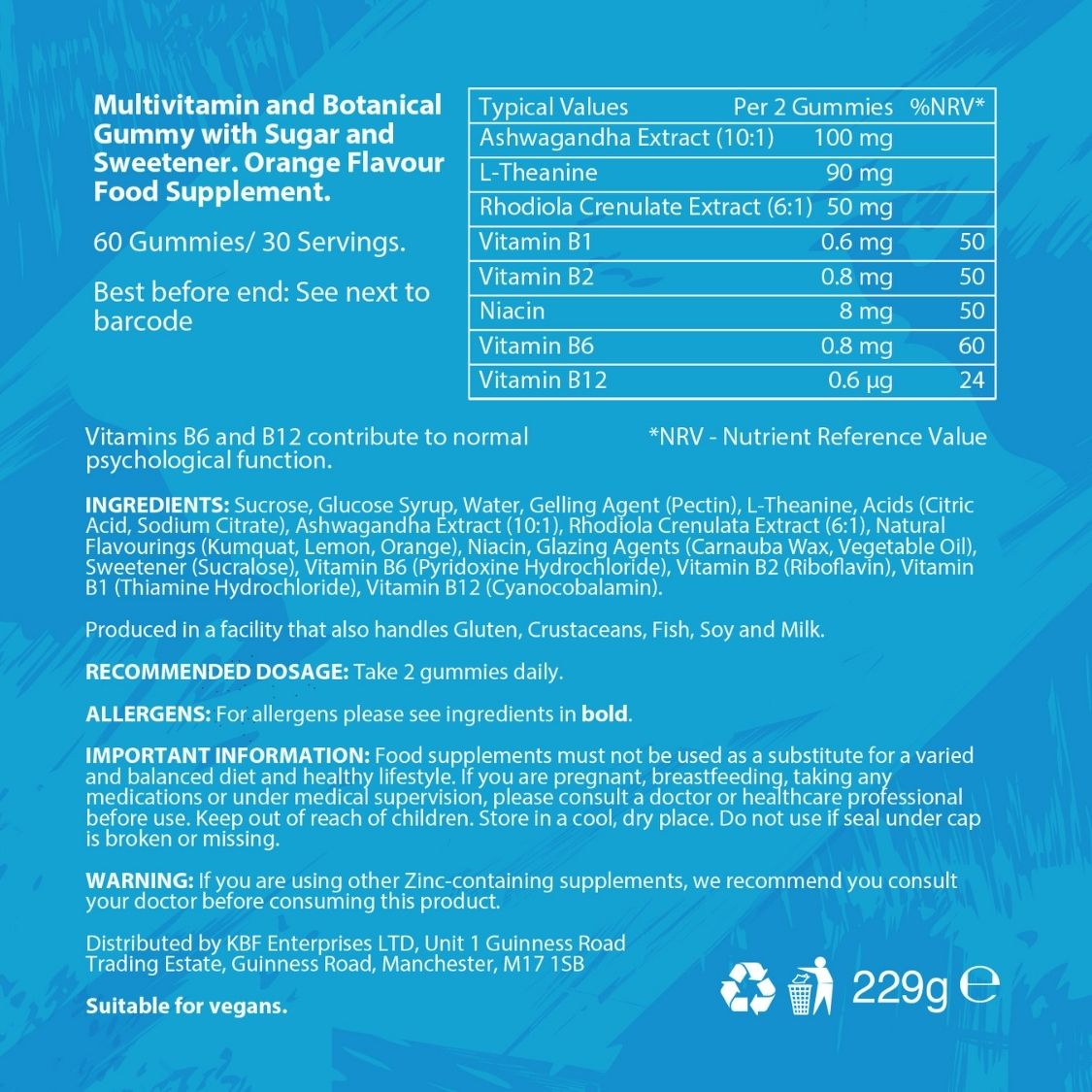 Ingredients per Gummy Ashwagandha Extract 10:1 - 50mg (Yielding 500mg) L-Theanine - 60mg Rhodiola Crenulata 6.5:1 - 25mg