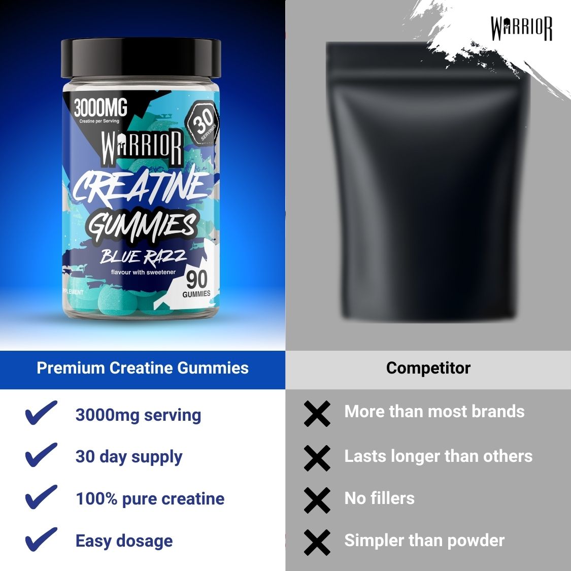Warrior Creatine Gummies deliver elite-level performance support in the most convenient format available. No mixing. No mess. No compromise.