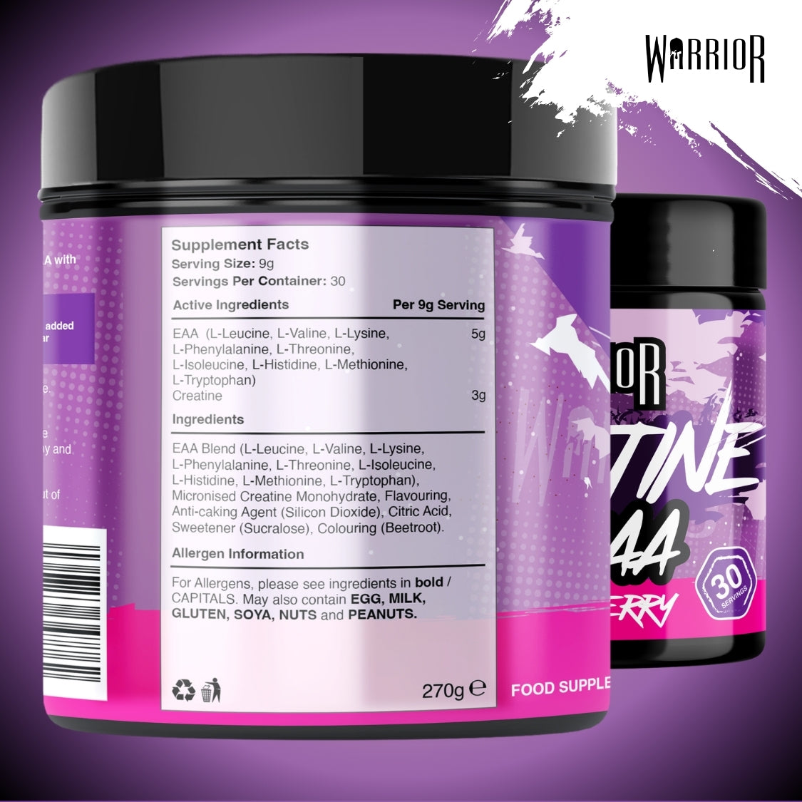 EAA Blend (L-Leucine, L-Valine, L-Lysine, L-Phenylalanine, L-Threonine, L-Isoleucine, L-Histidine, L-Methionine, L-Tryptophan), Micronised Creatine Monohydrate, Flavouring, Anti-Caking Agent (Silicon Dioxide), Citric Acid, Sweetener (Sucralose), Colouring (Beetroot).