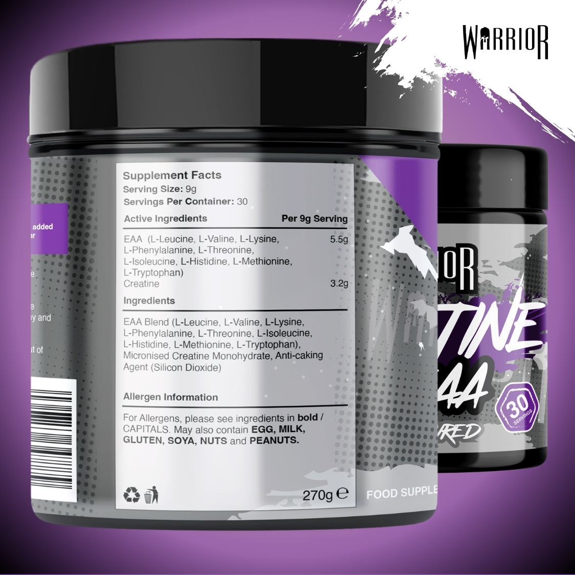 EAA Blend (L-Leucine, L-Valine, L-Lysine, L-Phenylalanine, L-Threonine, L-Isoleucine, L-Histidine, L-Methionine, L-Tryptophan), Micronised Creatine Monohydrate, Anti-Caking Agent (Silicon Dioxide).